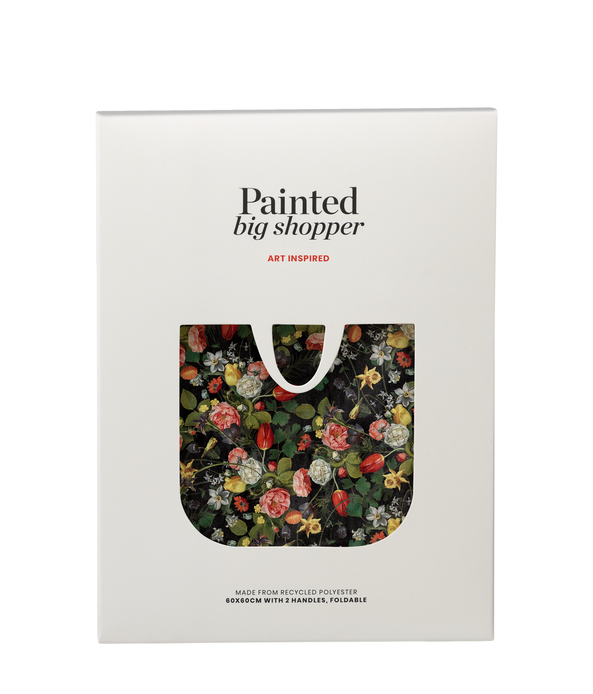 This big shopper is inspired by a sparkling bouquet featured in a larger still-life painted by Clara Peeters. Born around 1588 in Antwerp, Clara was among the few professional female painters of the 17th century. Her banquet pieces, known for their detail in depicting magnificent flowers alongside food, cups and other attributes, left an influence on painters from the Northern Netherlands.