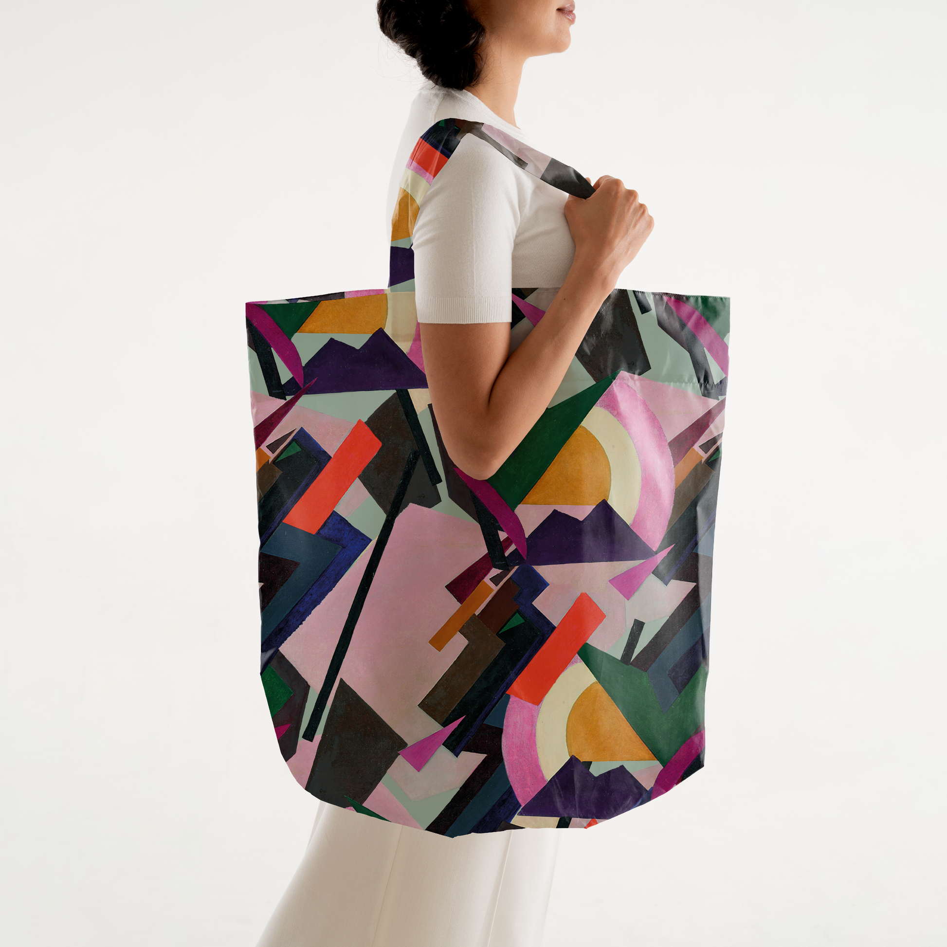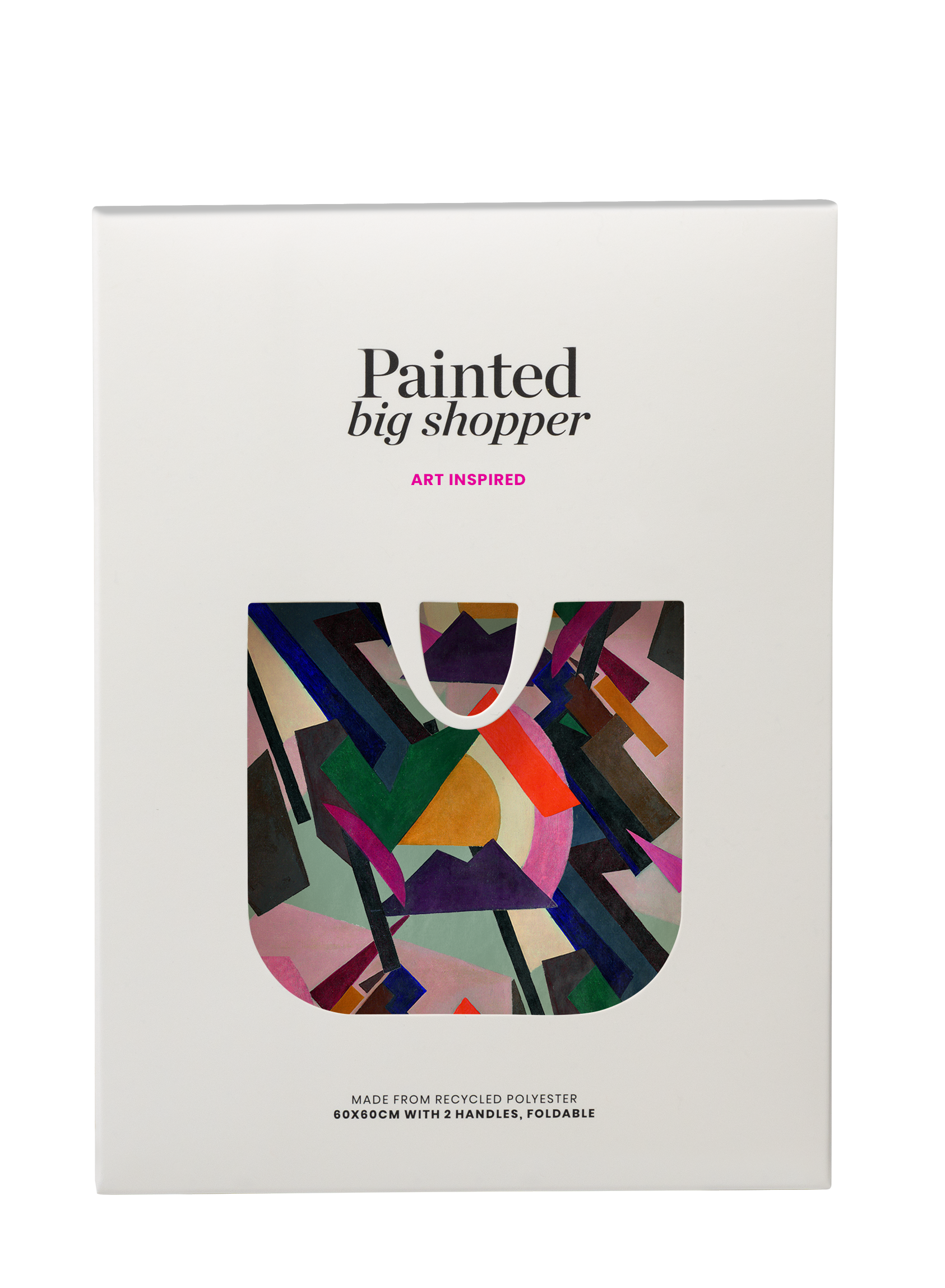 This big shopper is inspired by a collage by the Russian painter Olga Rozanova from the early 20th century. She called her collages 'paste-ons': a combination of planes, lines and discs and no incorporation whatsoever of real objects. Rozanova was part of the 'Supremus' which was a group of avant-garde artists (led by Malevich) who turned art into a cosmic showdown of geometric forms, tearing down all academic art rules.
