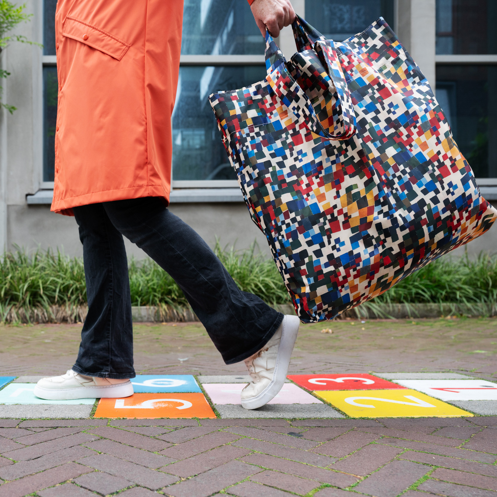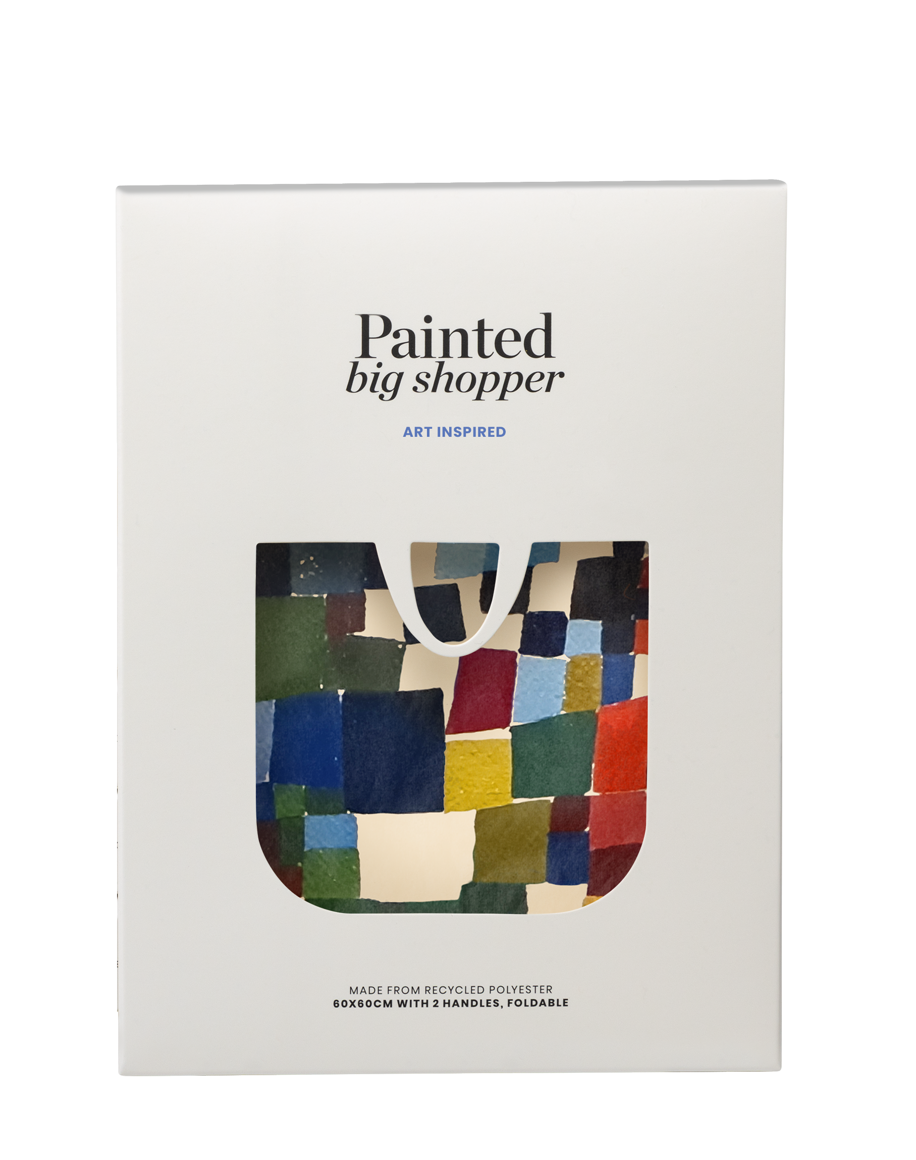 This big shopper is inspired by a colourful geometric painting from the Swiss multi-disciplinary artist Sophie Taeuber-Arp (1889-1943). Refusing to be put in a box, she worked as a performer, painter, teacher, designer, puppet maker, dancer, sculptor, illustrator and more. She literally dabbed in everything! Her creative journey took her once to Paris, where she joined the artists' group 'Circle and Rectangle'. It greatly inspired her and it is no wonder she was all about abstract forms and shapes.