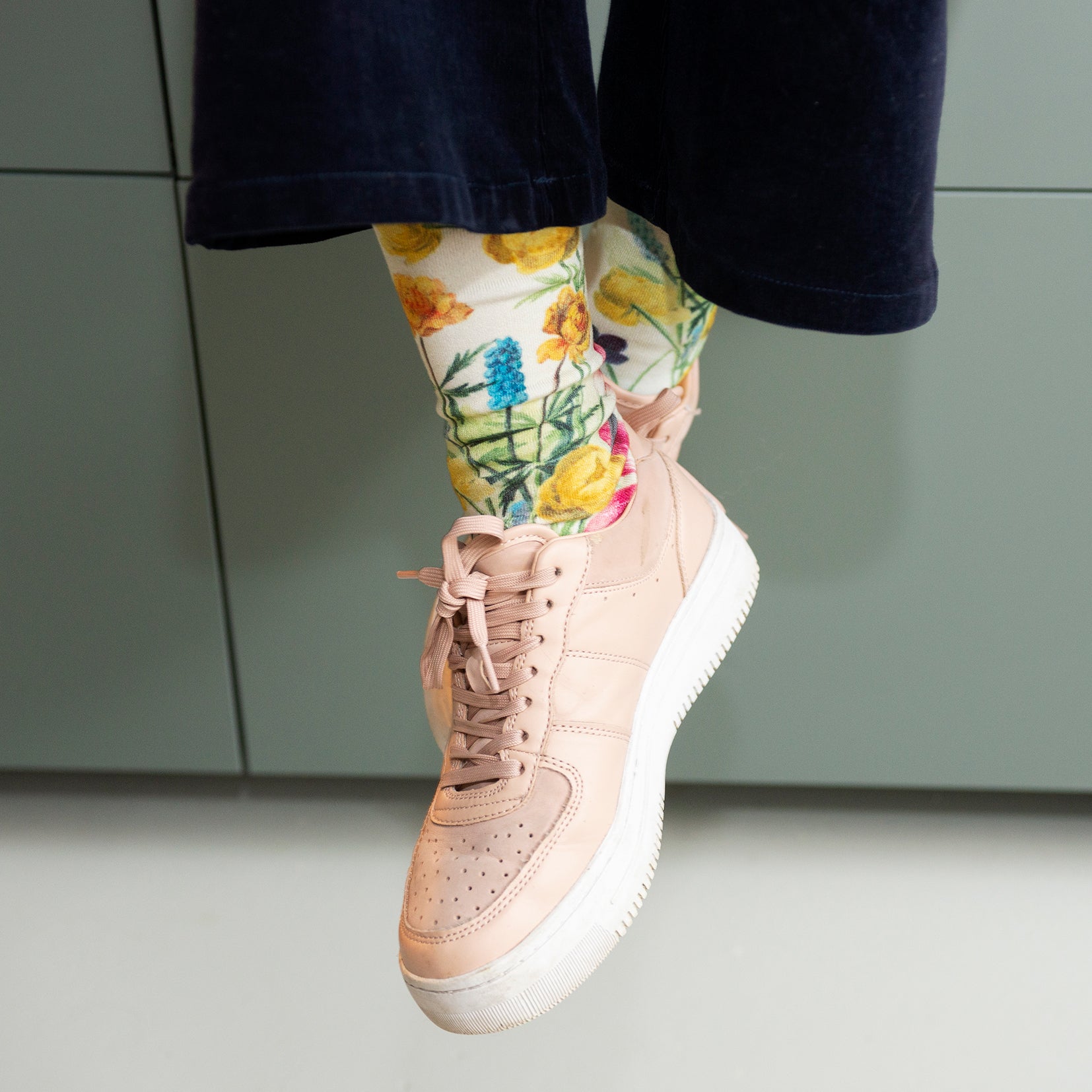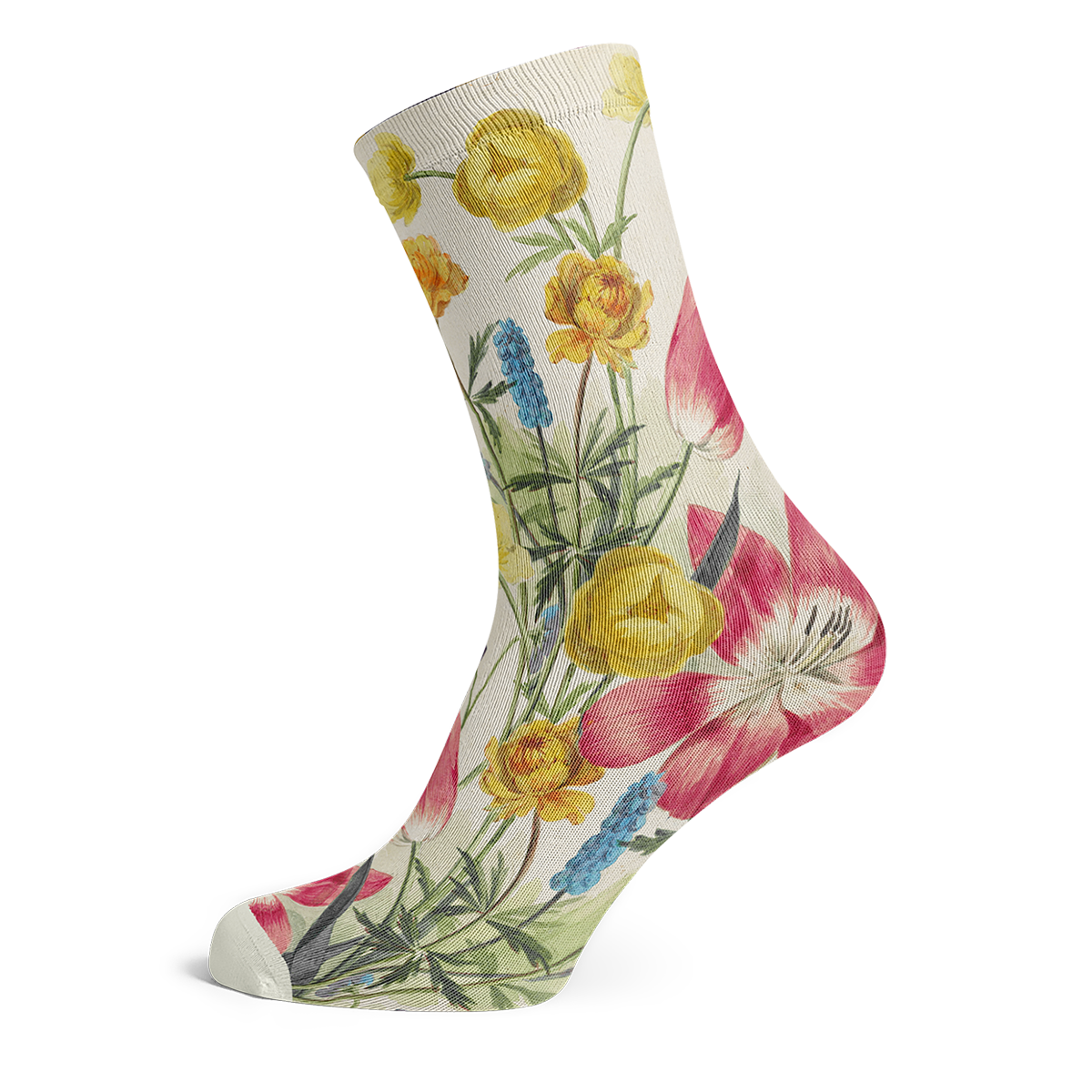 These socks are inspired by a tiny watercolour painted by the 18th century Dutch painter Willem van Leen: ‘Bouquet of tulips, violets, blue grapes and dotters’. The original only measures 21x14,4cm and is one of the many studies Van Leen undertook to practice his skills for the successful flower painter he would become.
