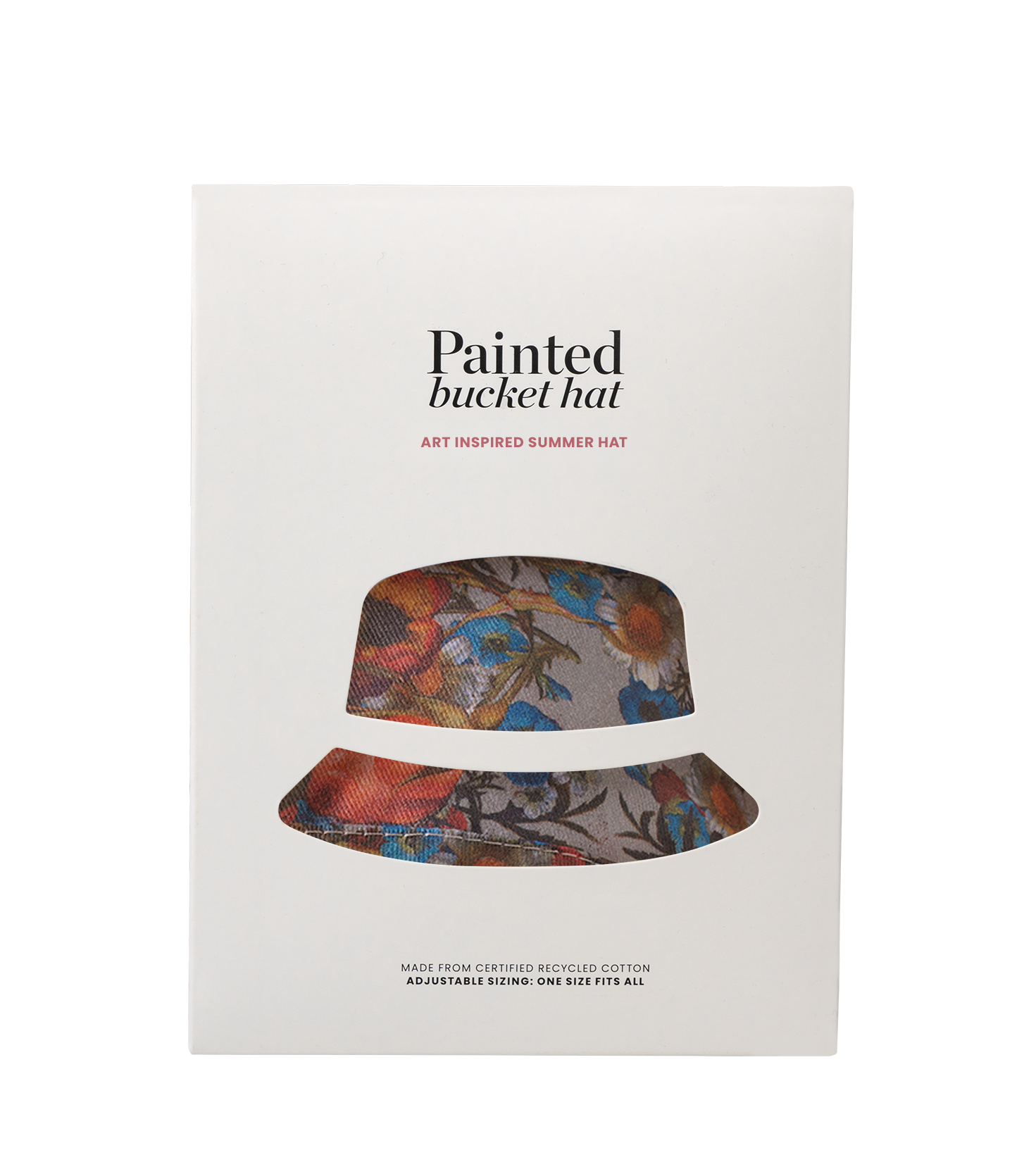 This cotton hat is inspired by one the many colourful paintings made by Rachel Ruysch! Born in a blooming era in the Netherlands, she revolutionized floral compositions in the 17th and 18th century. With a botanist father's collection, she had access to paint rare flowers and animals. Her talent earned her permission from her father to pursue an art education! While not unique due to a progressive attitude towards female artists, it remained unusual.