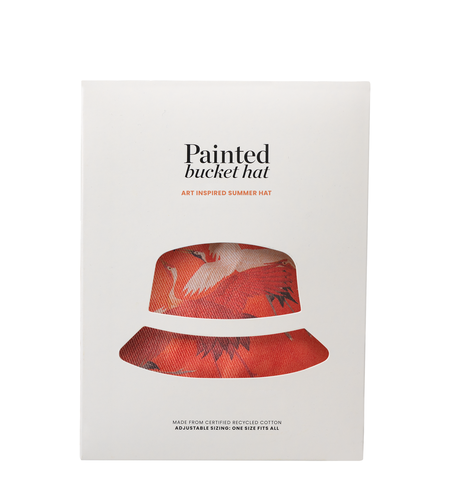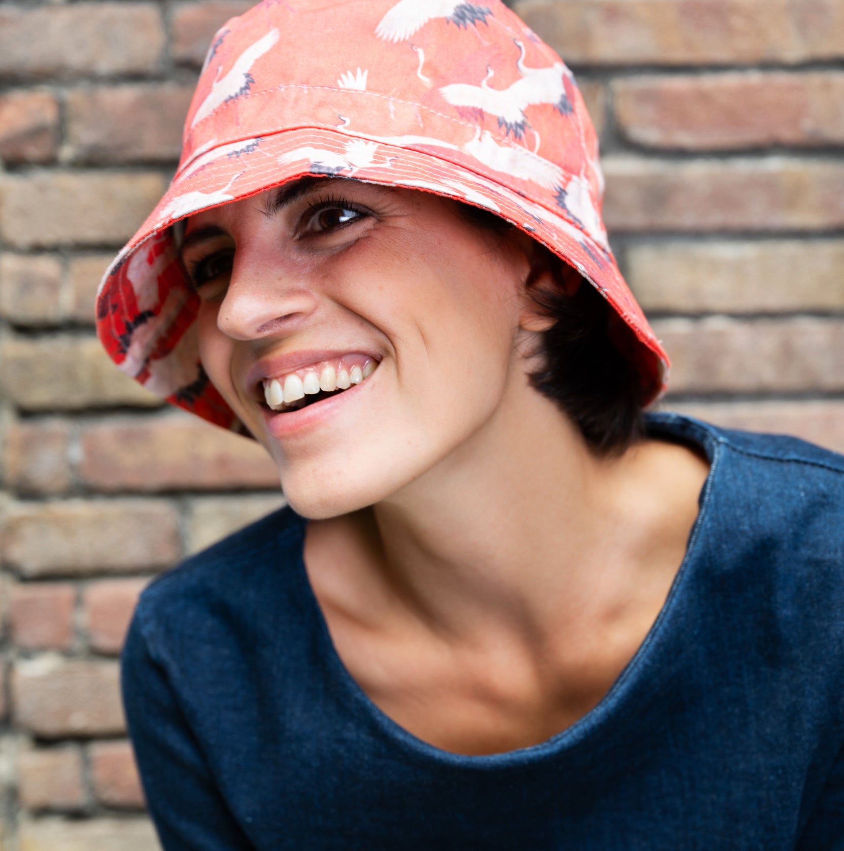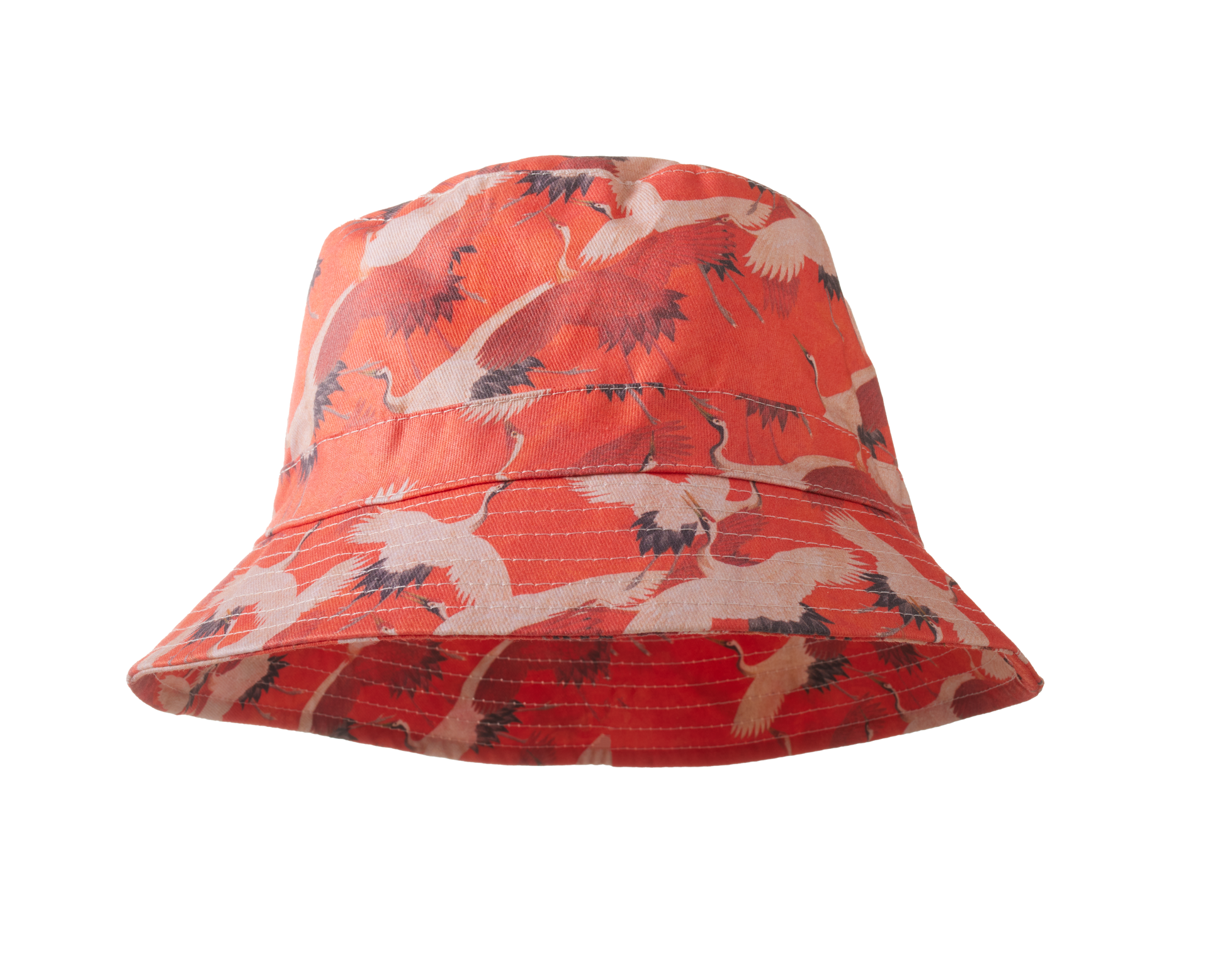 This cotton hat is inspired by a pattern design of Japanese cranes, pictured on a 100-year old ‘furisode’. This is a precious Japanese kimono only worn by young, unmarried women. The word ‘kimono’ literally means ‘something to wear’, a slight hint that the most important feature is its pattern, taken from nature and bursting with symbolism.