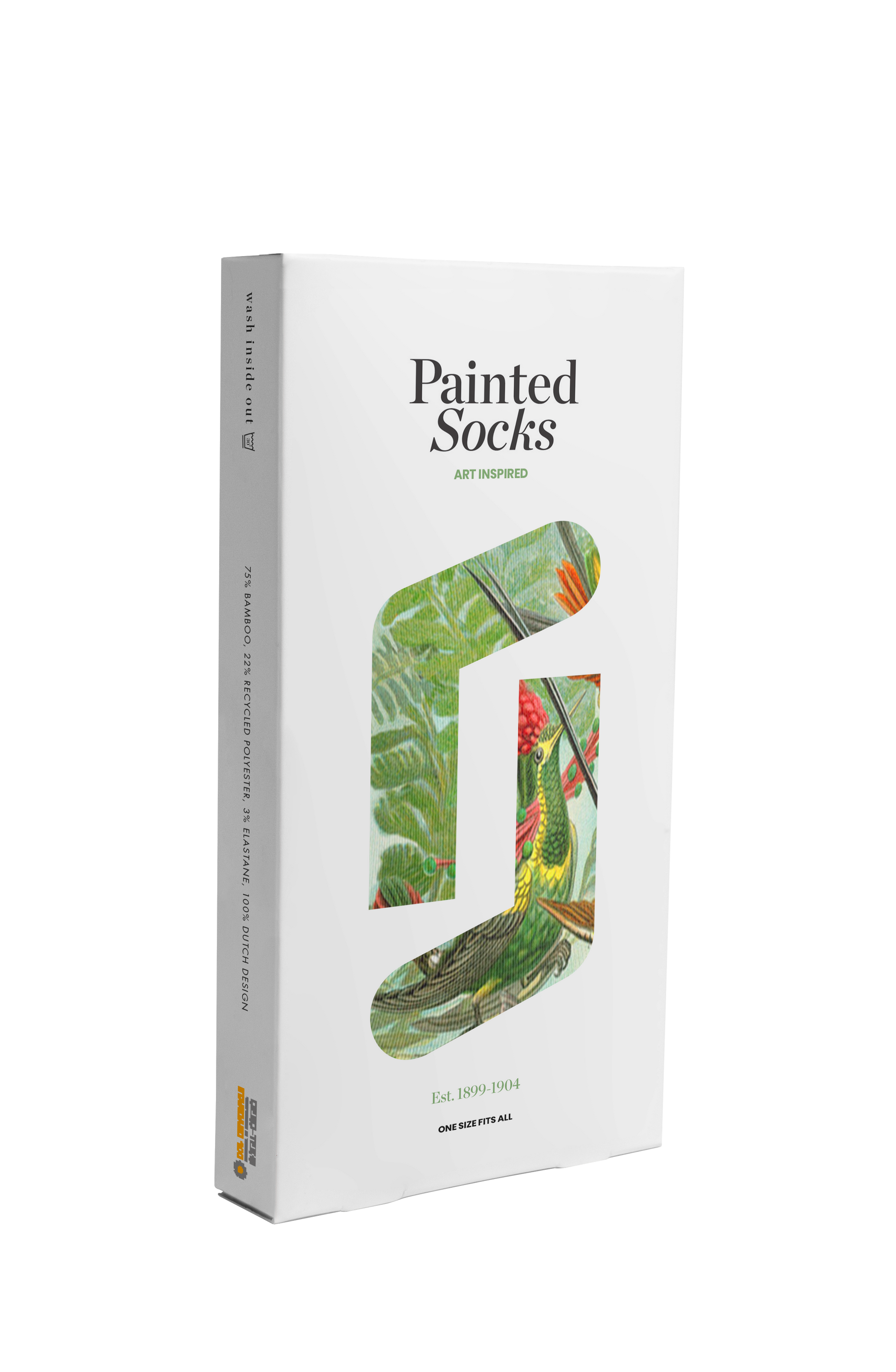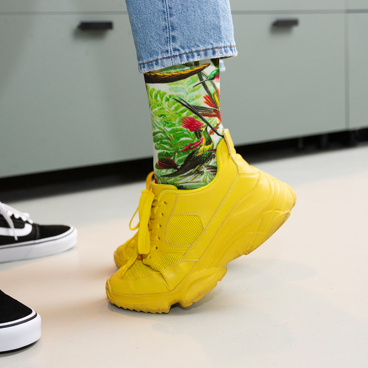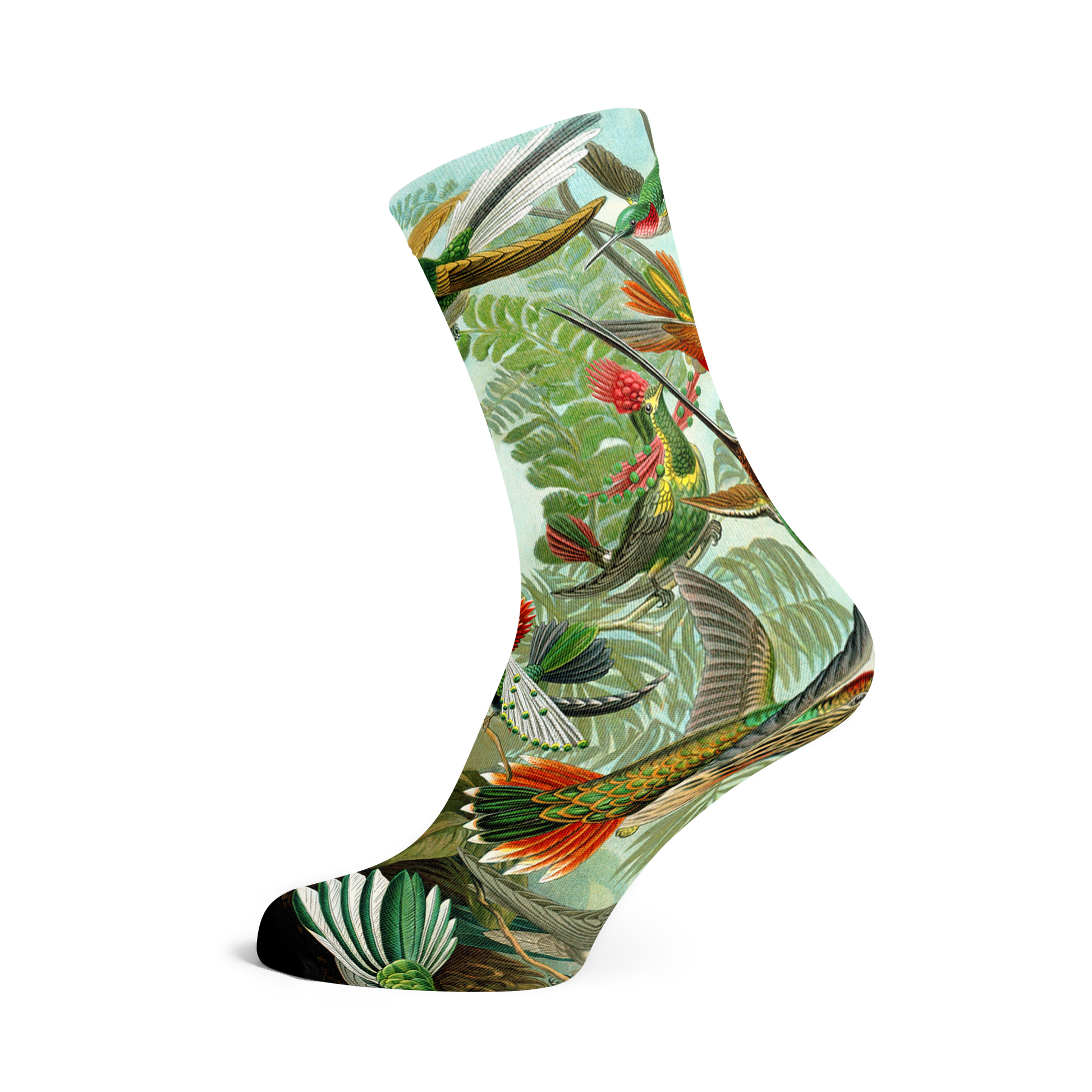 These socks are inspired by the most cheerful and colourful illustration Ernst Haeckel has left us. As a zoologist he must have been extremely fascinated by the out-of-this- world features of the Trochilidae, better known as hummingbirds. You’ll surround yourself with the smallest birds in the world, the hummingbirds, capable of flying backwards as well as forwards, and even able to hover in mid-air.