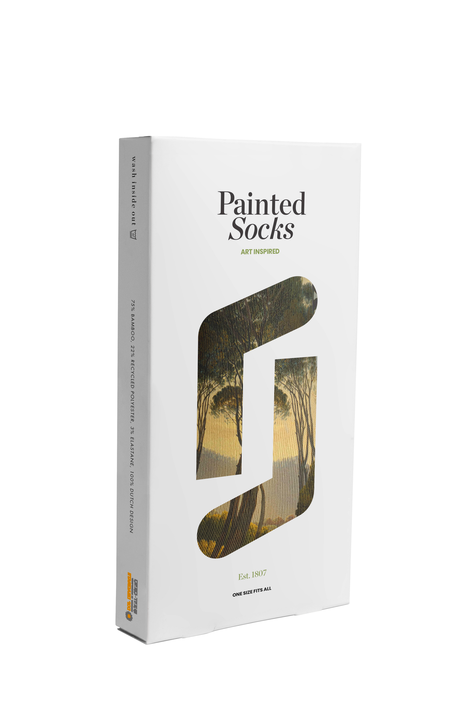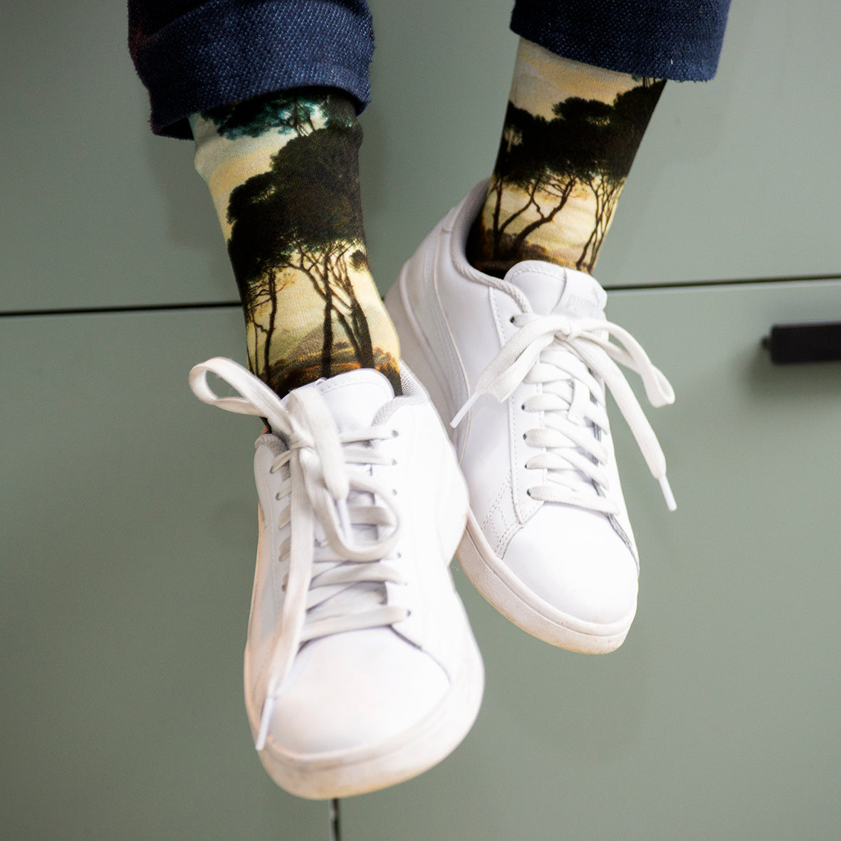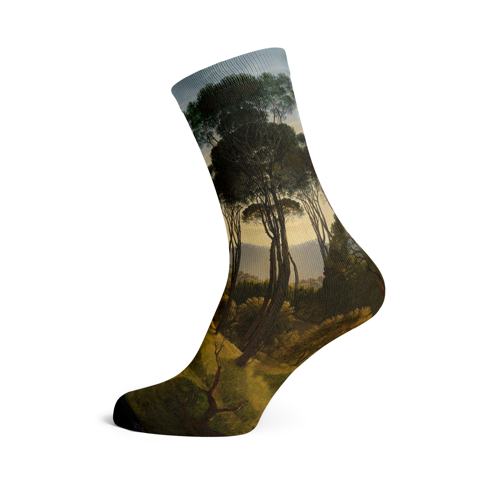 These socks are inspired by the gardens of the Villa Borghese in Rome, painted in the early 19th Century by the Dutch painter Hendrik Voogd. Leaving for Italy at the age of 20 thanks to a small allowance of a patronage, Voogd lost his artistic heart to the Italian landscape. There he remained until his death in Rome, spending a lifetime in catching the Italian clear, golden sunlight in paint.