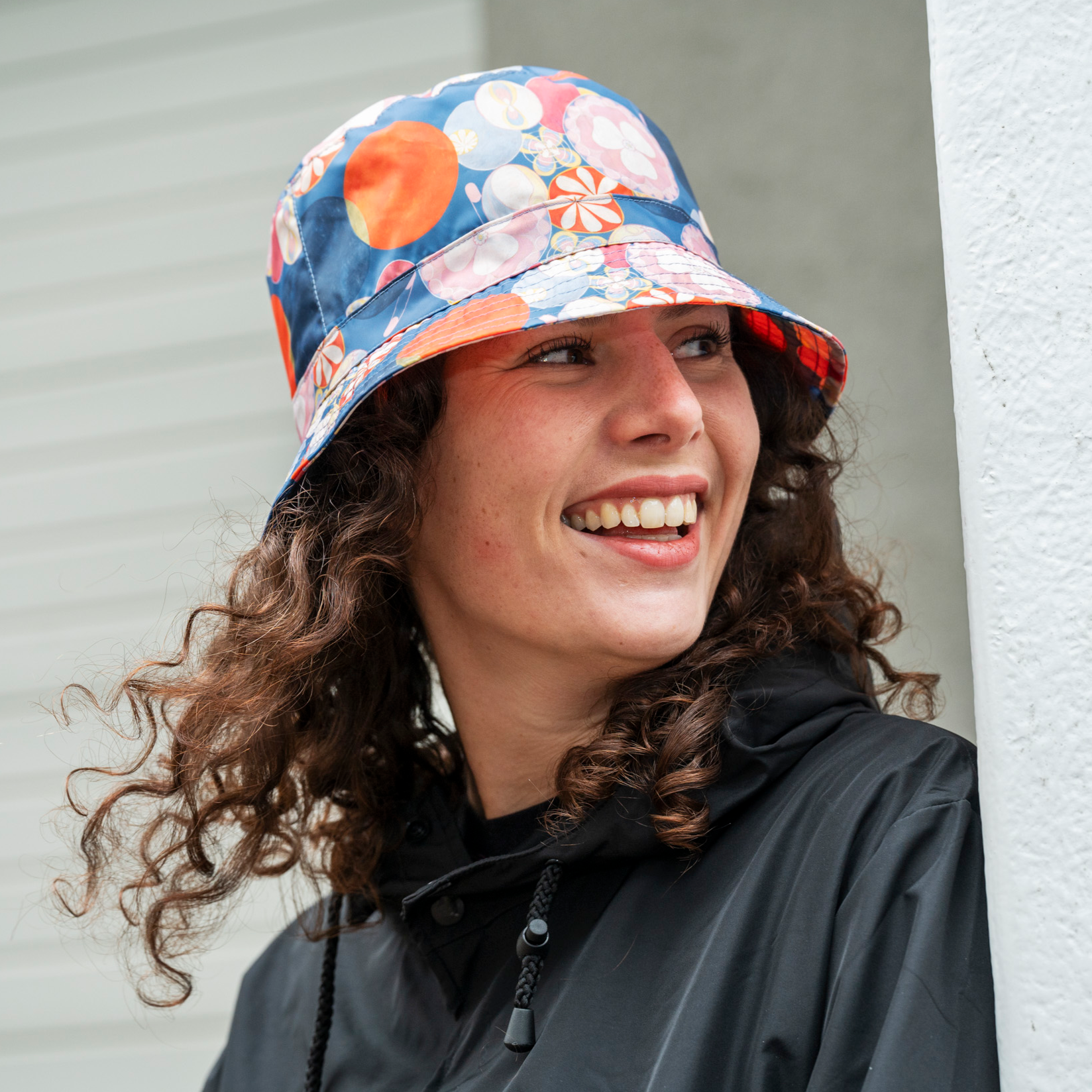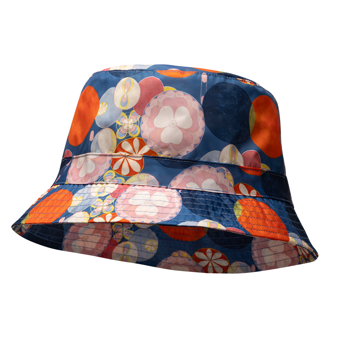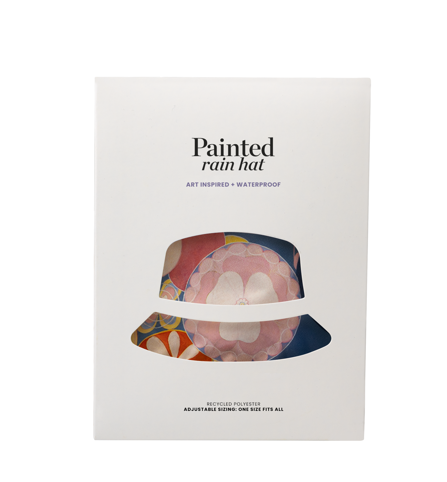This rain hat is inspired by Painting No. 2, part of a series of ten wall-sized paintings Swedish painter Hilma af Klint made for a temple (which was never built). Af Klint was interested in spiritualism and the subconscious. She was one of the first artists to experiment with automatic drawing, a technique in which the artist allows her hand to move freely across the paper without conscious control.