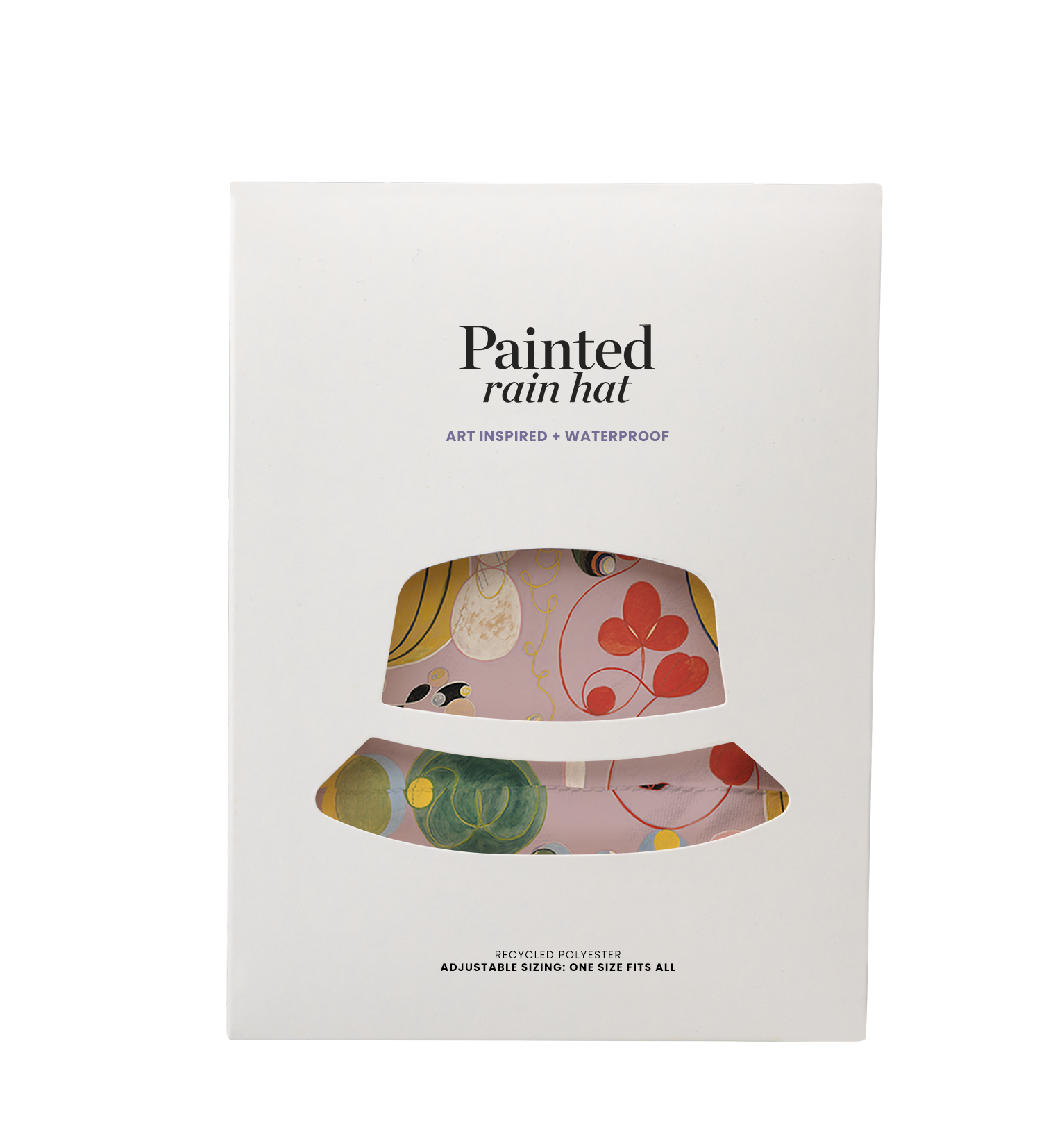 This rain hat is inspired by Painting No. 7, part of a series of ten wall-sized paintings Swedish painter Hilma af Klint made for a temple (which was never built). Af Klint was interested in spiritualism and the subconscious. She was one of the first artists to experiment with automatic drawing, a technique in which the artist allows her hand to move freely across the paper without conscious control.