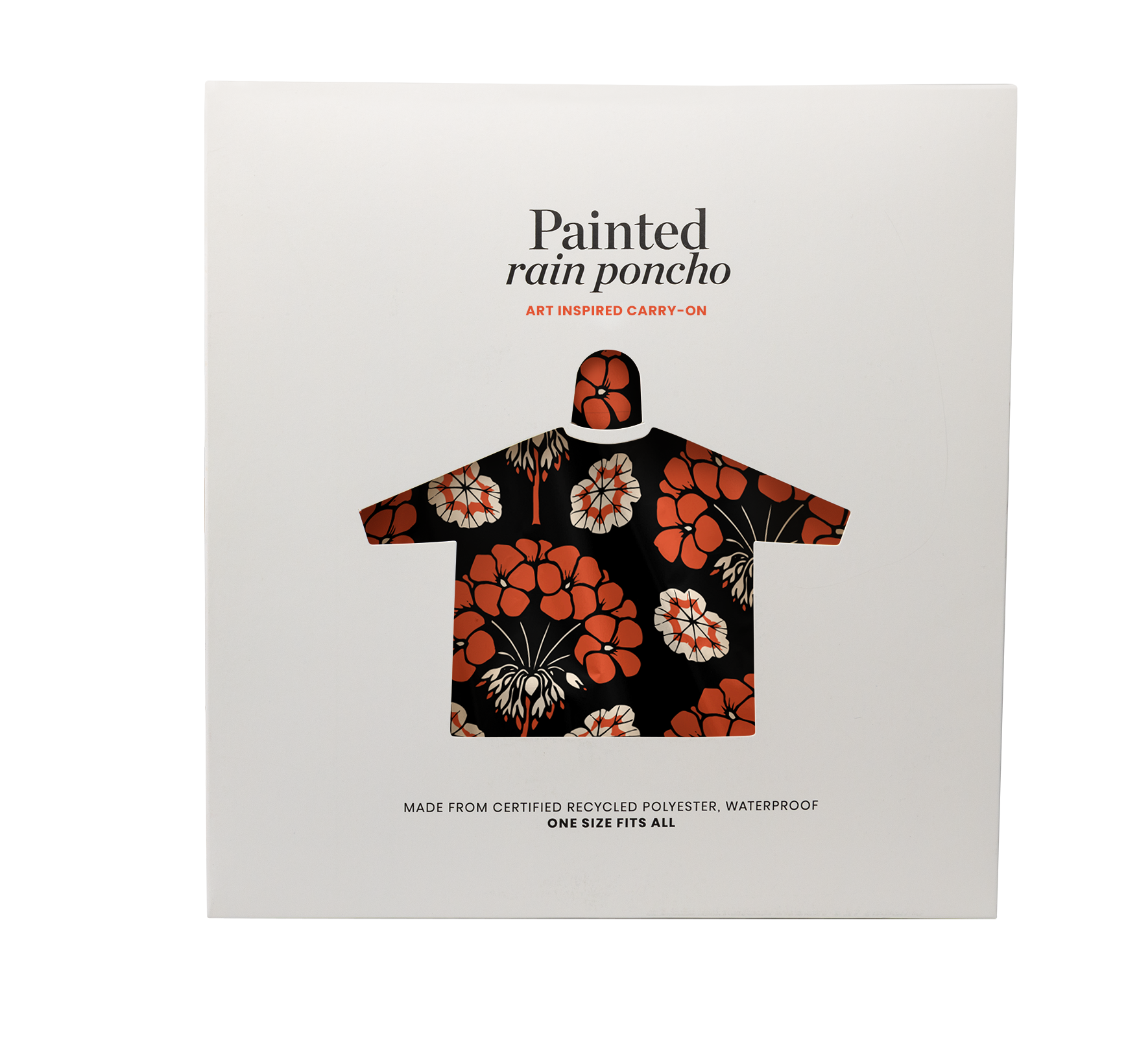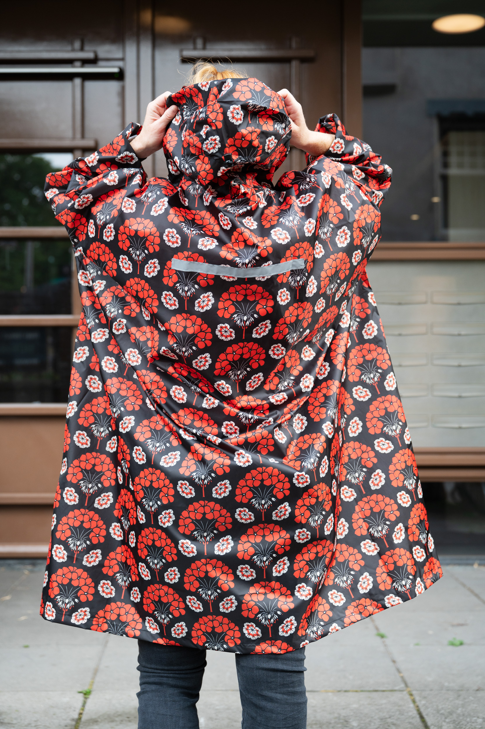 This rainponcho is inspired by the work of Dutch artist Julie de Graag (1877 – 1924). In this artwork the East Indian Cherry is depicted, a colourful annual flower which has inspired many artists throughout history. De Graag’s most-used technique was wood-block printing with nature as her favorite subject and abstract as her chosen style.