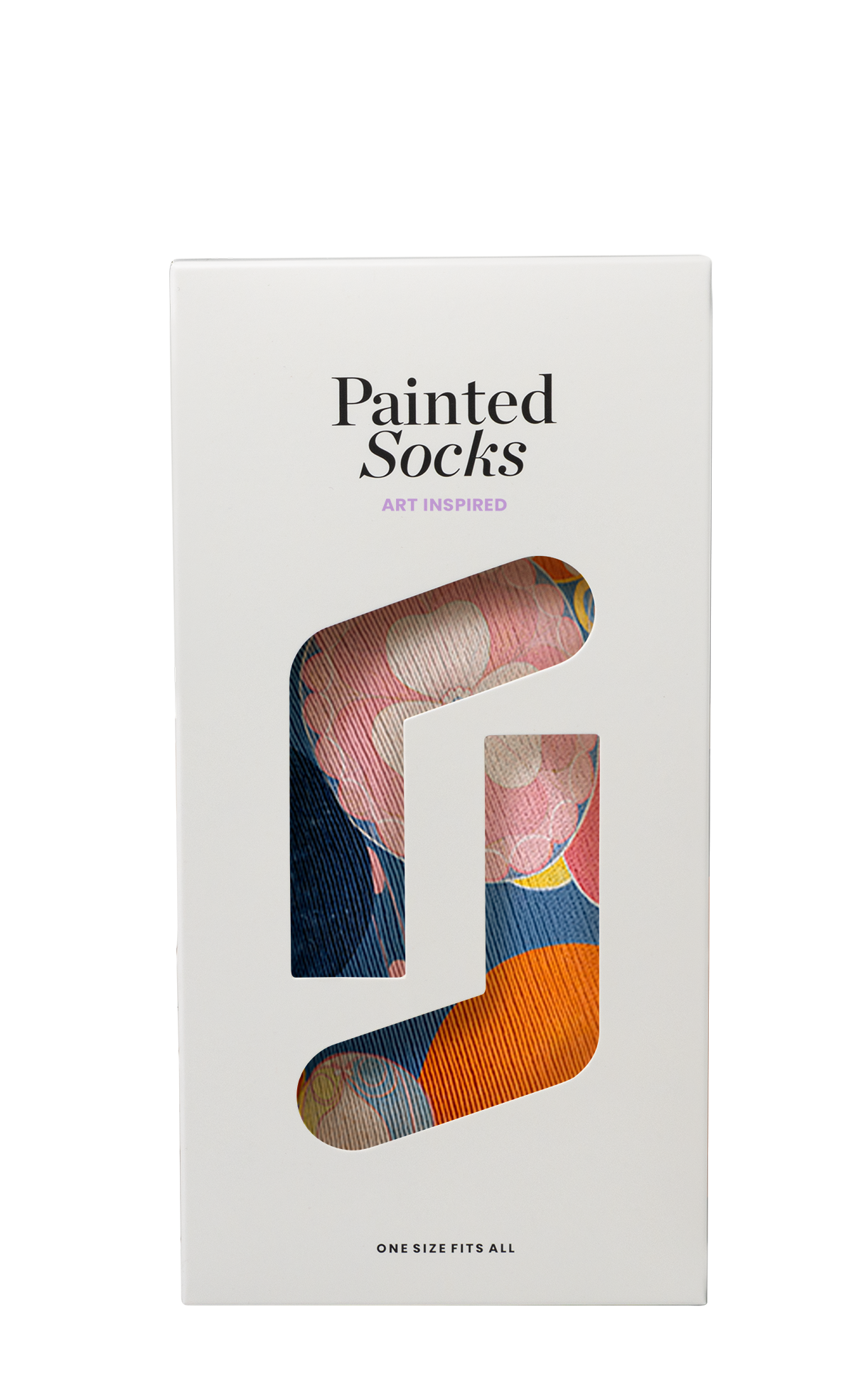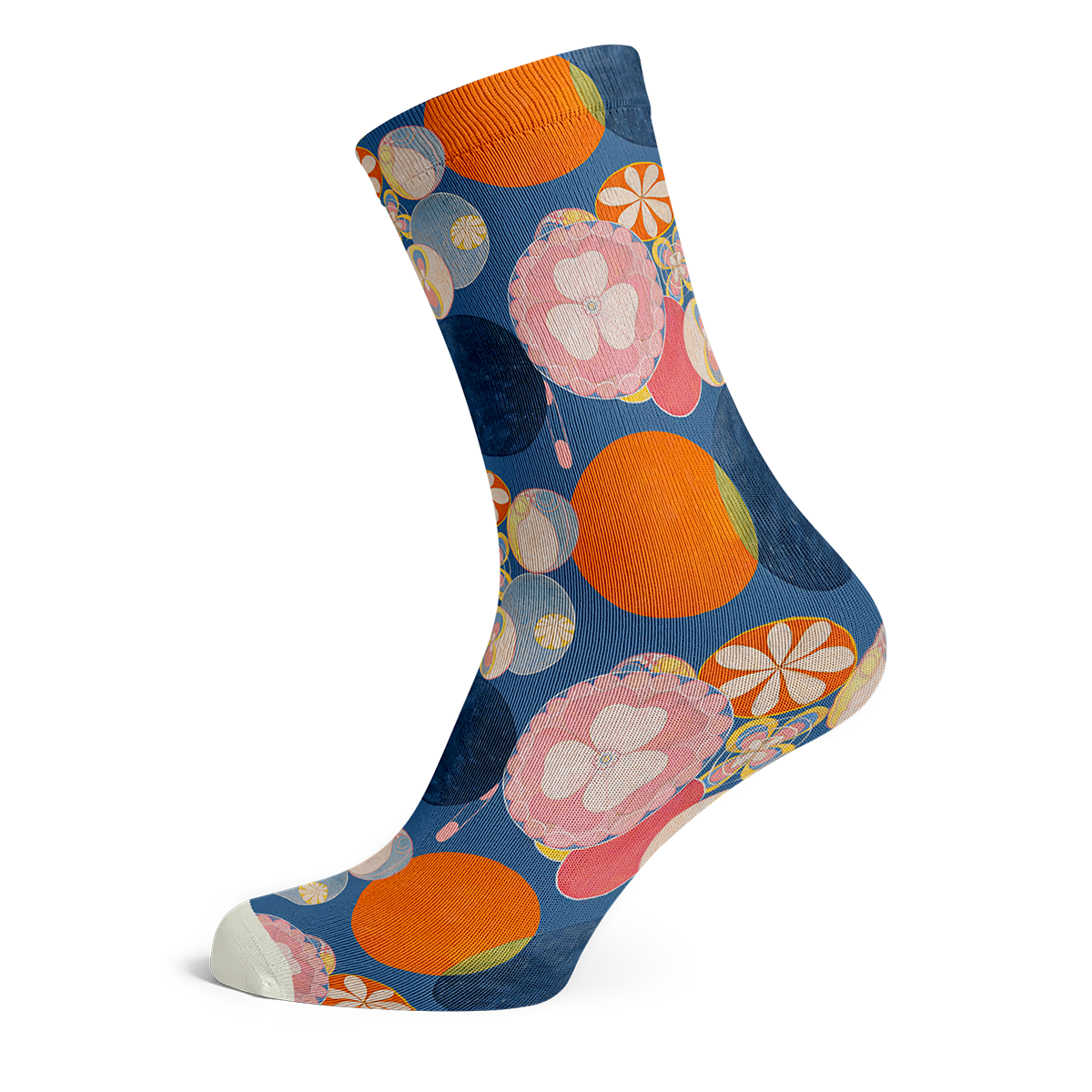 These socks are inspired by Painting No. 2, part of a series of ten wall-sized paintings Swedish painter Hilma af Klint made for a temple (which was never built). Af Klint was interested in spiritualism and the subconscious. She was one of the first artists to experiment with automatic drawing, a technique in which the artist allows her hand to move freely across the paper without conscious control.
