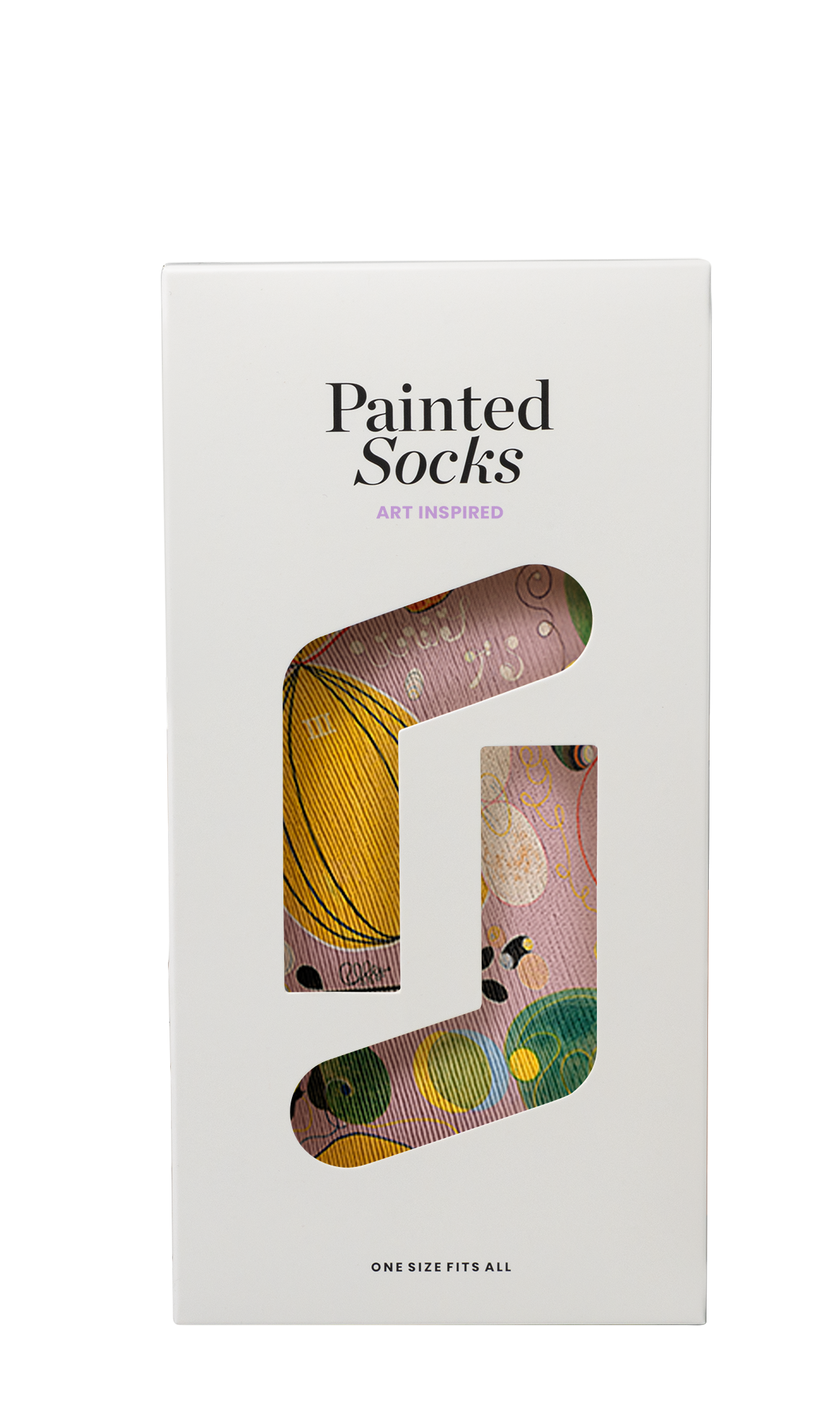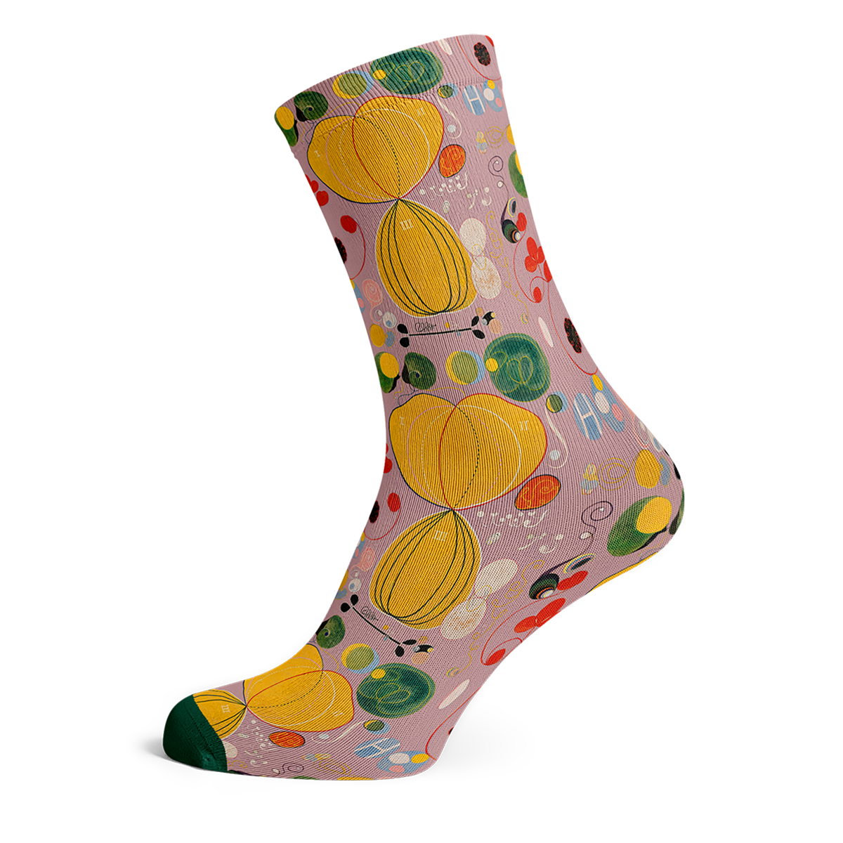 These socks are inspired by Painting No. 7, part of a series of ten wall-sized paintings Swedish painter Hilma af Klint made for a temple (which was never built). Af Klint was interested in spiritualism and the subconscious. She was one of the first artists to experiment with automatic drawing, a technique in which the artist allows her hand to move freely across the paper without conscious control.