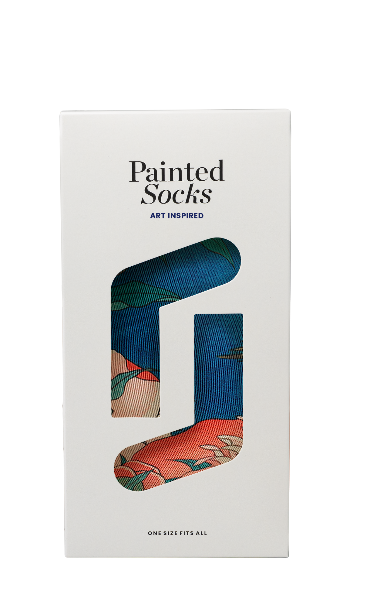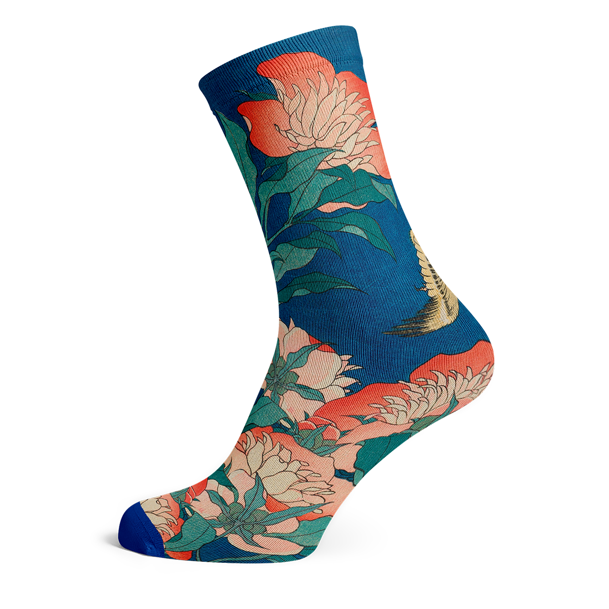 These socks are inspired by a series of woodcuts of birds and flowers by Japanese artist Hokusai, world-famous for his obsession with depicting Mount Fuji. Just think of The Great Wave off Kanagawa (1831).