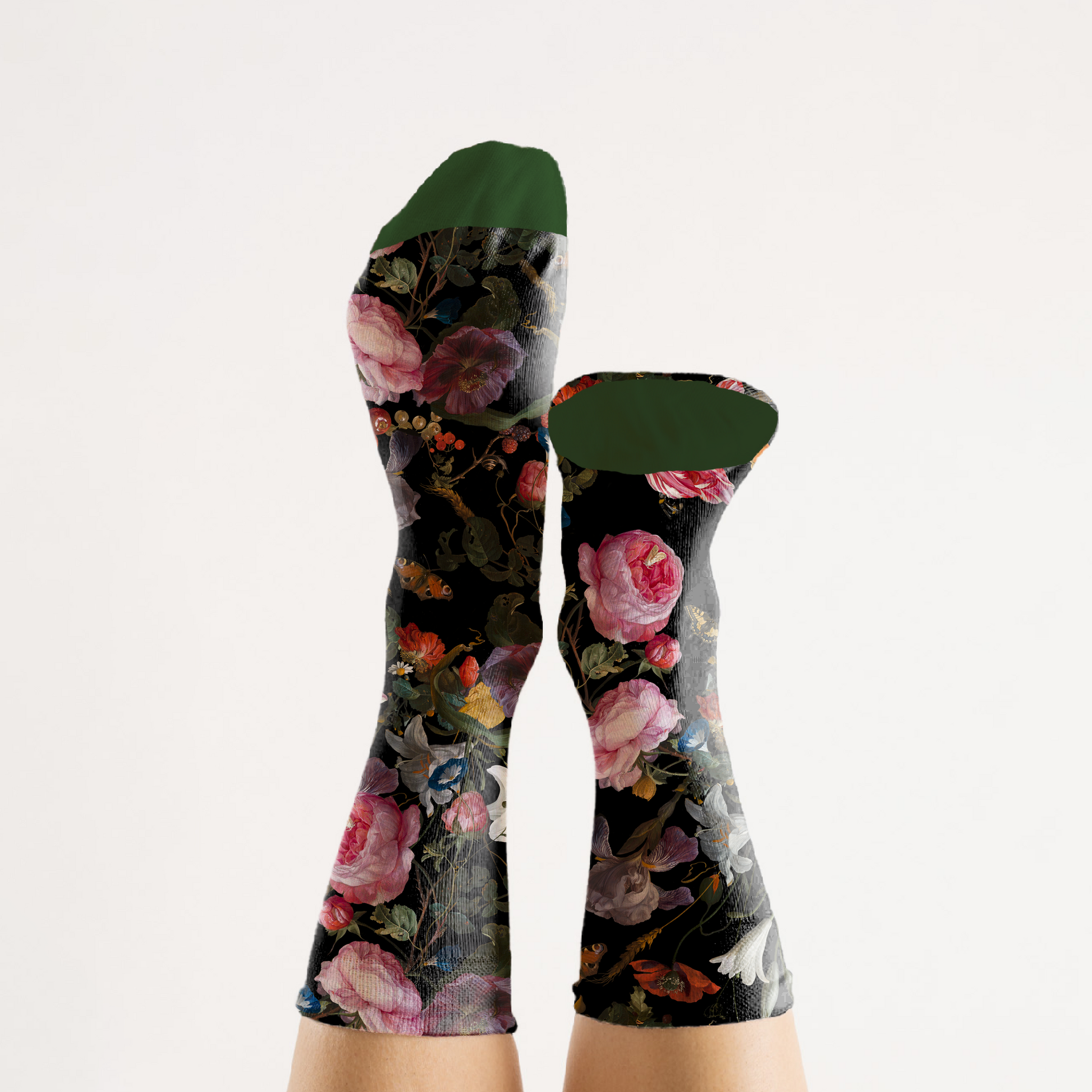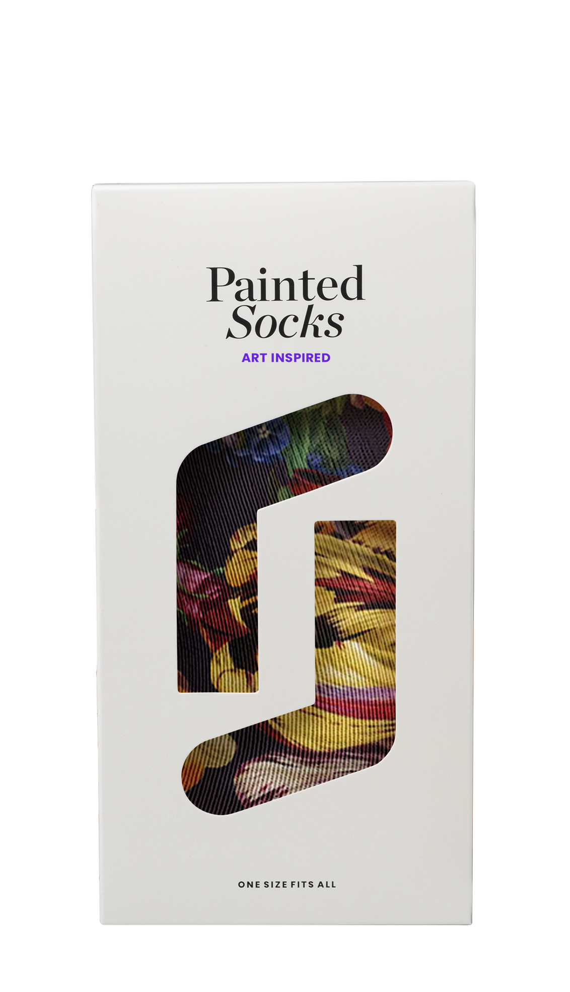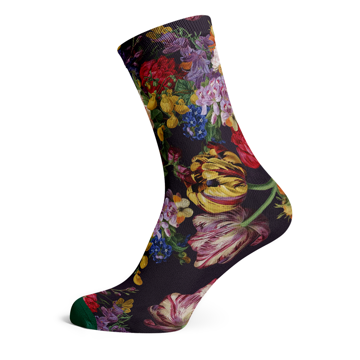 These socks are inspired by a 19th century still life painting by Dutch artist Henriëtte Gertruida Knip, not to be confused with her niece and namesake known for cat paintings! Knip is less well known today, but she was no average painter. Even at a young age, her still-lifes in oil and watercolour were immensely popular! Imagine a medley of roses, tulips, ladies’ purses and mysterious black irises – all flamenco in a vase.