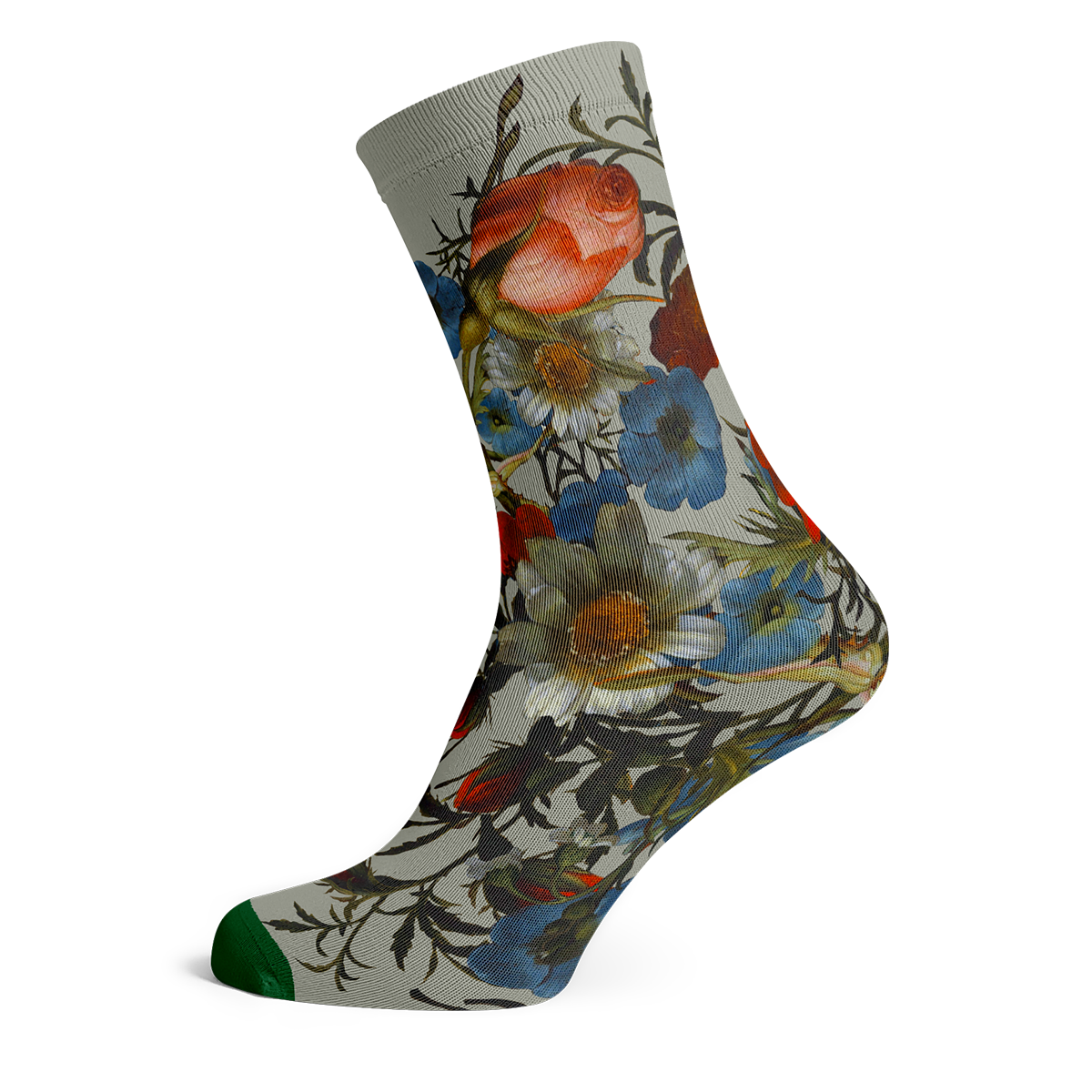 These socks are inspired by one the many colourful paintings made by Rachel Ruysch! Born in a blooming era in the Netherlands, she revolutionized floral compositions in the 17th and 18th century. With a botanist father's collection, she had access to paint rare flowers and animals. Her talent earned her permission from her father to pursue an art education! While not unique due to a progressive attitude towards female artists, it remained unusual.