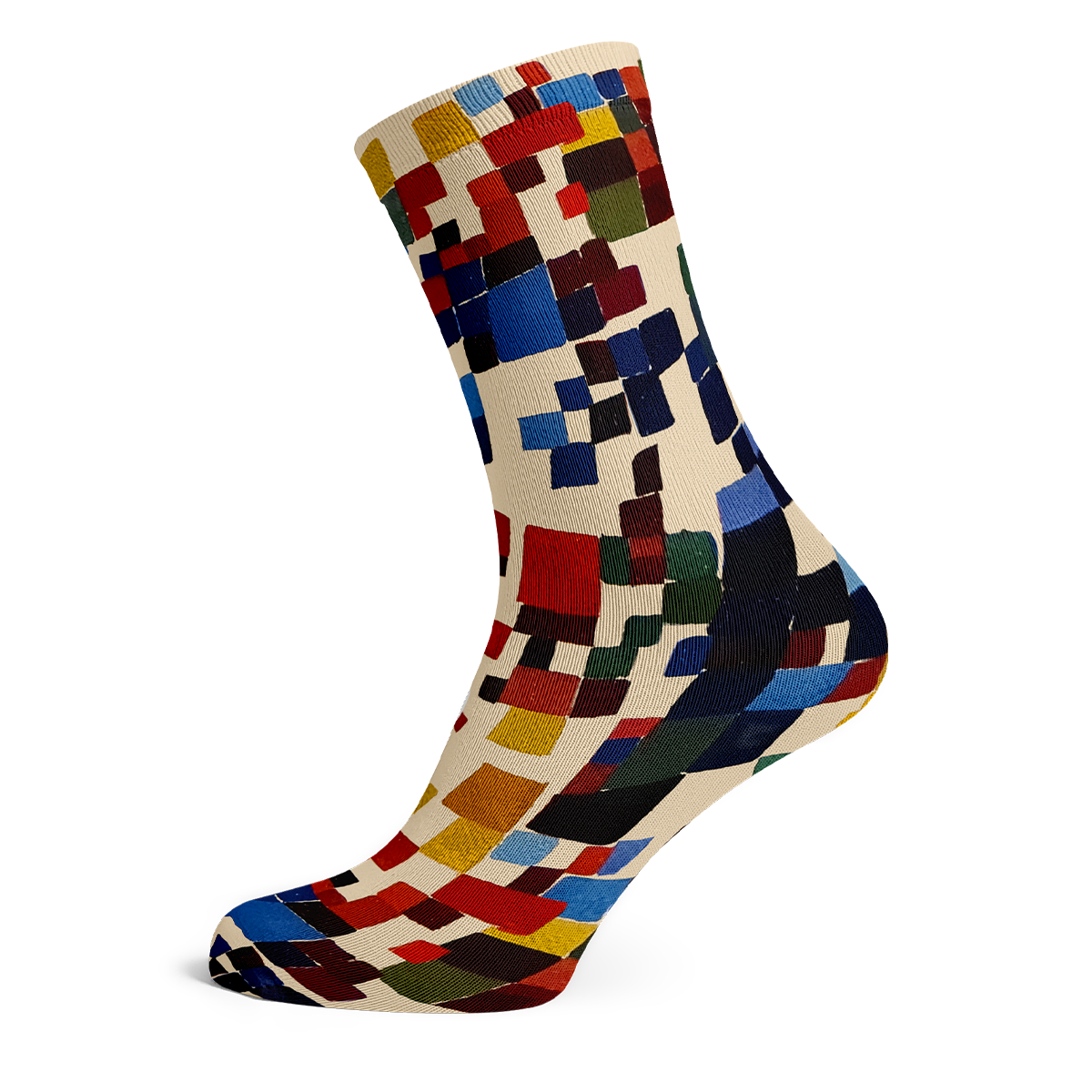 These socks are inspired by a colourful geometric painting from the Swiss multi-disciplinary artist Sophie Taeuber-Arp (1889-1943). Refusing to be put in a box, she worked as a performer, painter, teacher, designer, puppet maker, dancer, sculptor, illustrator and more. She literally dabbed in everything! Her creative journey took her once to Paris, where she joined the artists' group 'Circle and Rectangle'. It greatly inspired her and it is no wonder she was all about abstract forms and shapes.